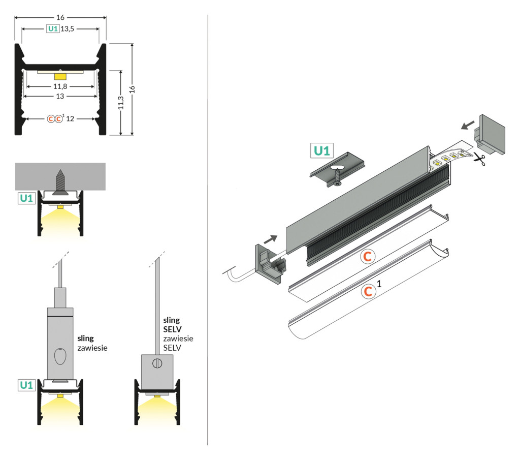 A BEGTON12 LED profil fedele a "C" klikk típusú fedél utólag a helyére pattintható, rögzítésre az U1 rögzítőt ajánljuk.